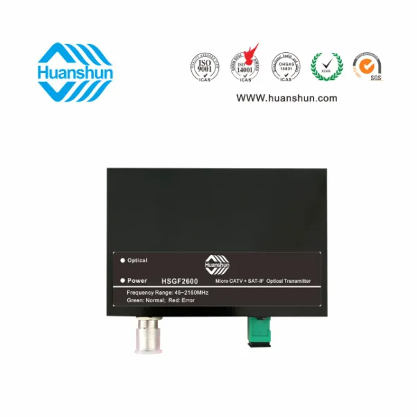 CATV&SAT-IF光發送機 | HSGF2600-1302 | RF工作帶寬45~2150MHz,光輸出功率有2或3mW可選,型號后綴13代表1310nm波長,15則代表1550nm波長,最后2位數字02表示2mW,03則表示3mW,RF接口F型公制或英制(訂貨時說明),光輸出接口SC/APC |